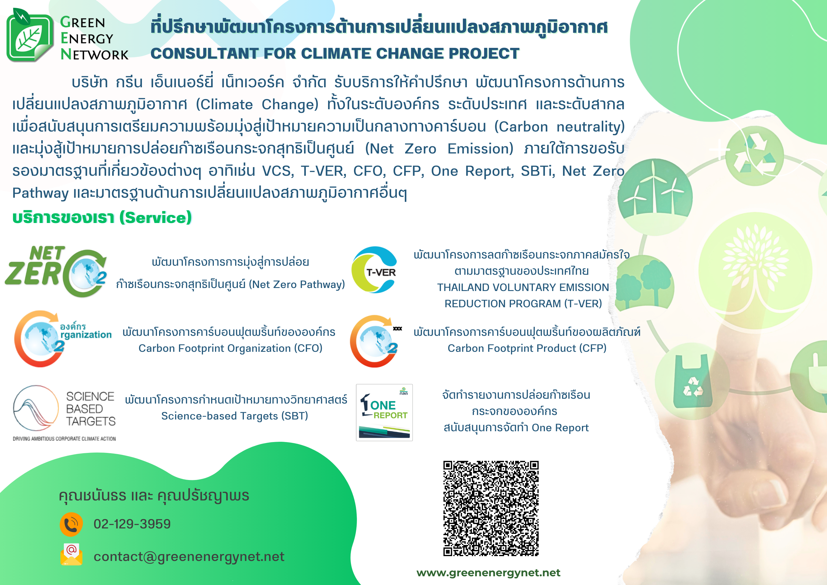 บริษัท กรีน เอ็นเนอร์ยี่ เน็ทเวอร์ค จำกัด รับบริการให้คำปรึกษา พัฒนาโครงการด้านการเปลี่ยนแปลงสภาพภูมิอากาศ (Climate Change)