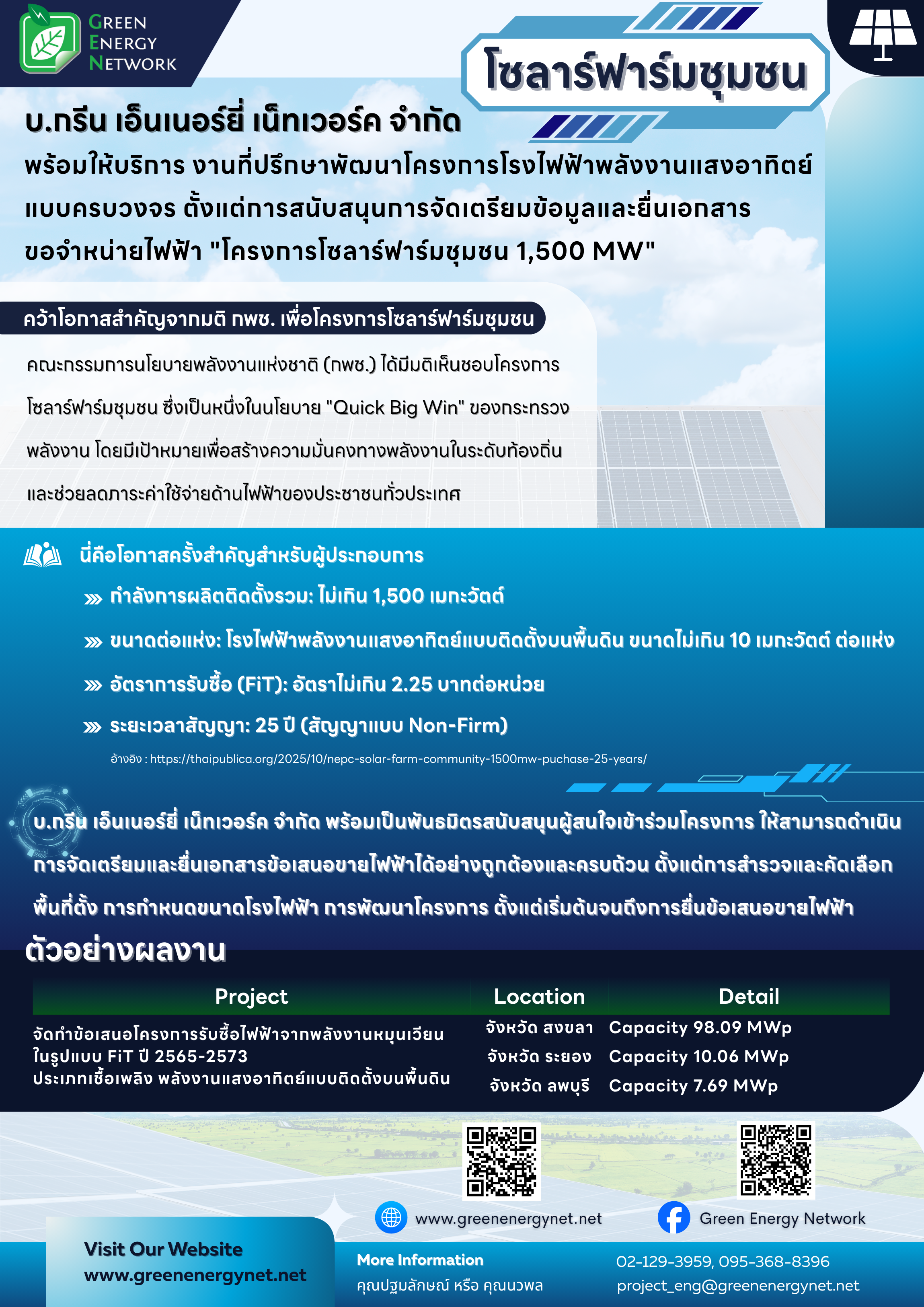 อ้างอิง: https://thaipublica.org/2025/10/nepc-solar-farm-community-1500mw-puchase-25-years/บ.กรีน เอ็นเนอร์ยี่ เน็ทเวอร์ค จำกัด