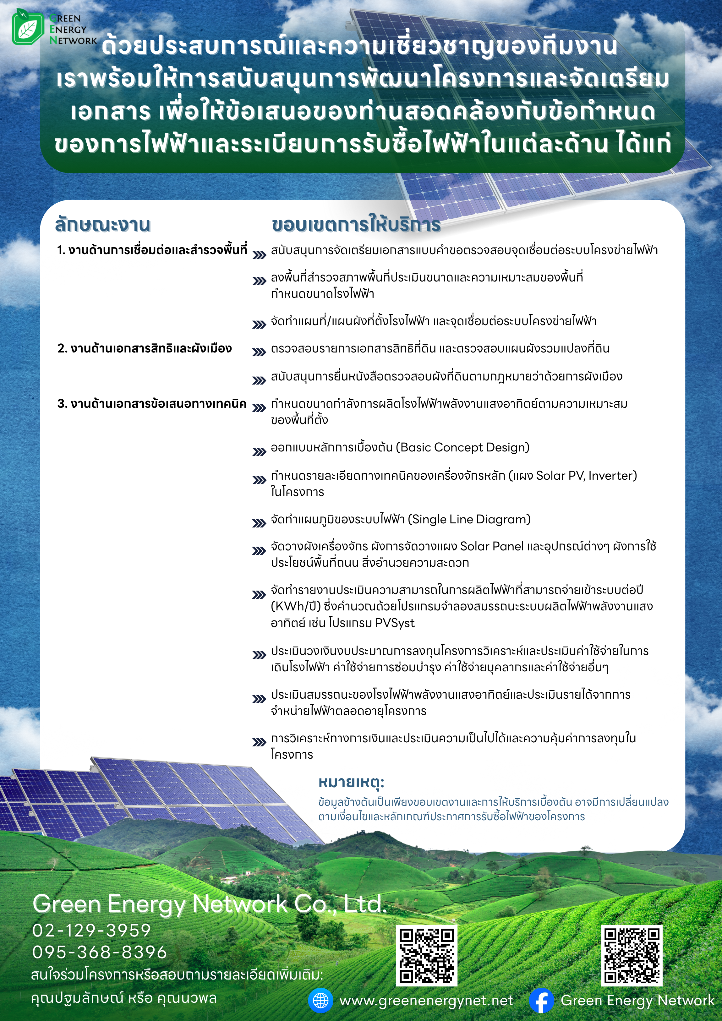 บ.กรีน เอ็นเนอร์ยี่ เน็ทเวอร์ค จำกัด (Green Energy Network Company Limited) พร้อมให้บริการ งานที่ปรึกษาพัฒนาโครงการโรงไฟฟ้าพลังงานแสงอาทิตย์แบบครบวงจร ตั้งแต่การสนับสนุนการจัดเตรียมข้อมูลและยื่นเอกสารขอจำหน่ายไฟฟ้า "โครงการโซลาร์ฟาร์มชุมชน 1,500 MW" นี่คือโอกาสครั้งสำคัญสำหรับผู้ประกอบการ พร้อมเป็นพันธมิตรสนับสนุนผู้สนใจเข้าร่วมโครงการให้สามารถดำเนินการจัดเตรียมและยื่นเอกสารข้อเสนอขายไฟฟ้าได้อย่างถูกต้องและครบถ้วน ตั้งแต่การสำรวจและคัดเลือกพื้นที่ตั้ง การกำหนดขนาดโรงไฟฟ้า การพัฒนาโครงการ ตั้งแต่เริ่มต้นจนถึงการยื่นข้อเสนอขายไฟฟ้า ตัวอย่างผลงาน ด้วยประสบการณ์และความเชี่ยวชาญของทีมงาน เราพร้อมให้การสนับสนุนการพัฒนาโครงการและจัดเตรียมเอกสาร เพื่อให้ข้อเสนอของท่านสอดคล้องกับข้อกำหนดของการไฟฟ้าและระเบียบการรับซื้อไฟฟ้าในแต่ละด้าน ได้แก่ หมายเหตุ: ข้อมูลข้างต้นเป็นเพียงขอบเขตงานและการให้บริการเบื้องต้น อาจมีการเปลี่ยนแปลงตามเงื่อนไขและหลักเกณฑ์ประกาศการรับซื้อไฟฟ้าของโครงการ